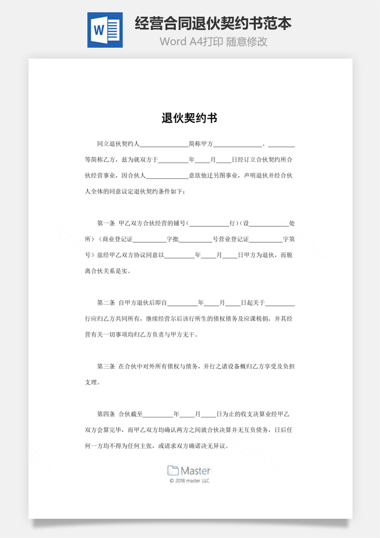 本模板为退伙契约书范本,文字图片可以直接替换,使用简单方便