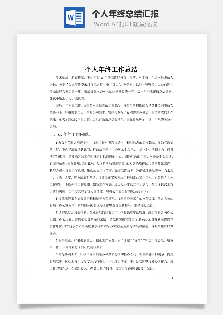 本模板为个人年终总结汇报word文档,文字图片可以直接替换,使用简单方便