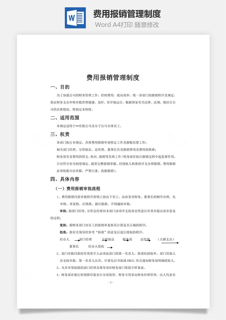 本模板为费用报销管理制度word文档,文字图片可以直接替换,使用简单方便